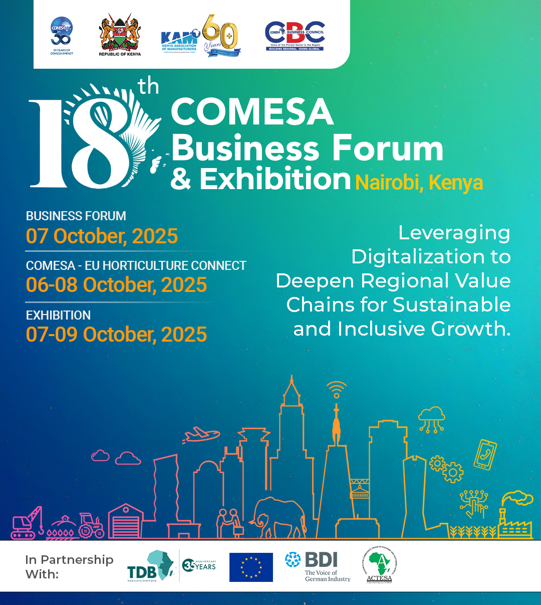 The COMESA Business Council (CBC), in collaboration with the COMESA Secretariat, the Government of Kenya, and the Kenya Association of Manufacturers, is pleased to announce the 18th COMESA Business Forum, scheduled for 7 October 2025 in Nairobi, Kenya.